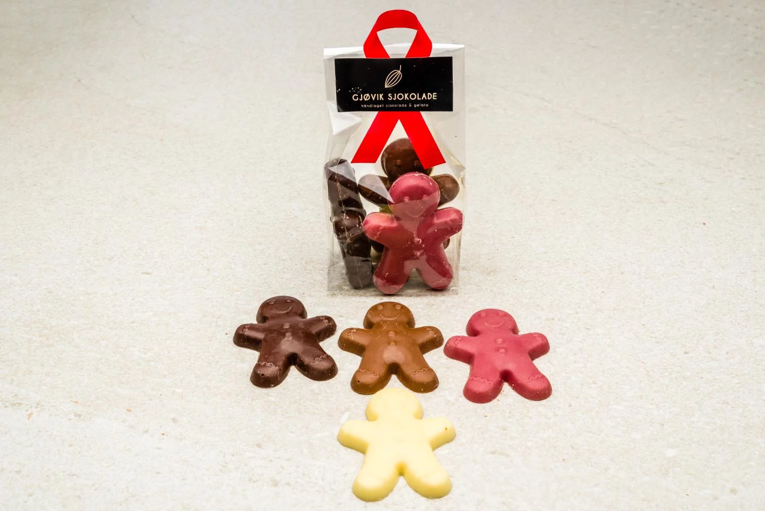 Kakemannpose inneholder åtte kakemenn i melkesjokolade, mørk sjokolade, hvit sjokolade og ruby sjokolade. Som da blir to av hver.